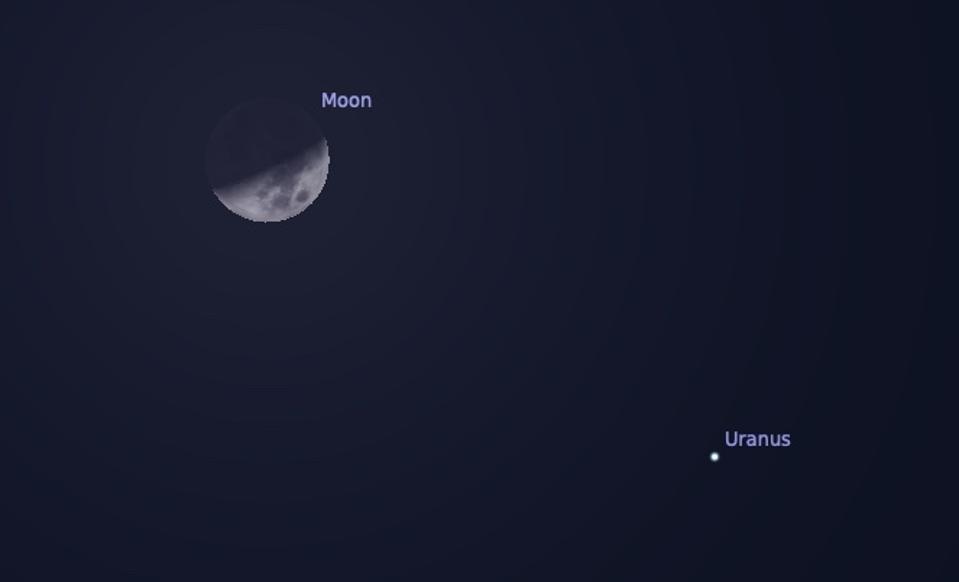 If you’ve never seen the seventh planet from the Sun tonight gives you a great chance. Uranus is very close to the 44%-lit waxing crescent Moon, and if you have a pair of binoculars you can likely get them both in the same field of view.