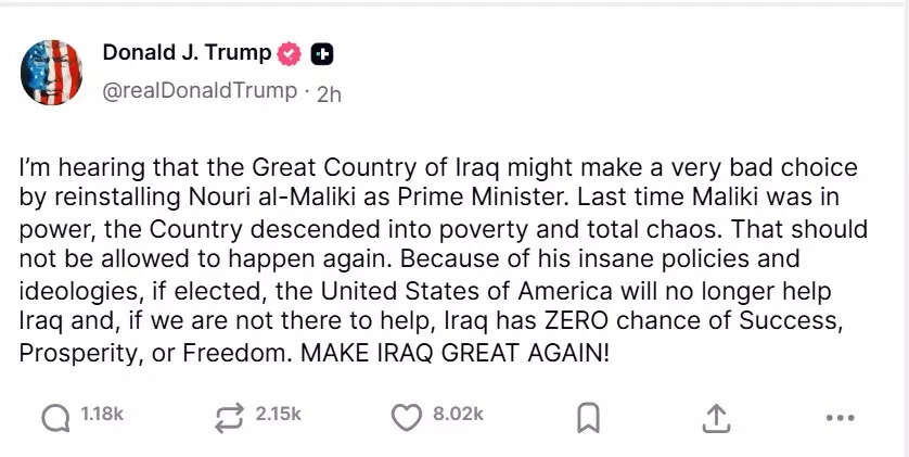 In a post on his Truth Social platform, Trump said that when Maliki was last in office, Iraq fell into poverty and chaos. He said this should not be allowed to happen again.