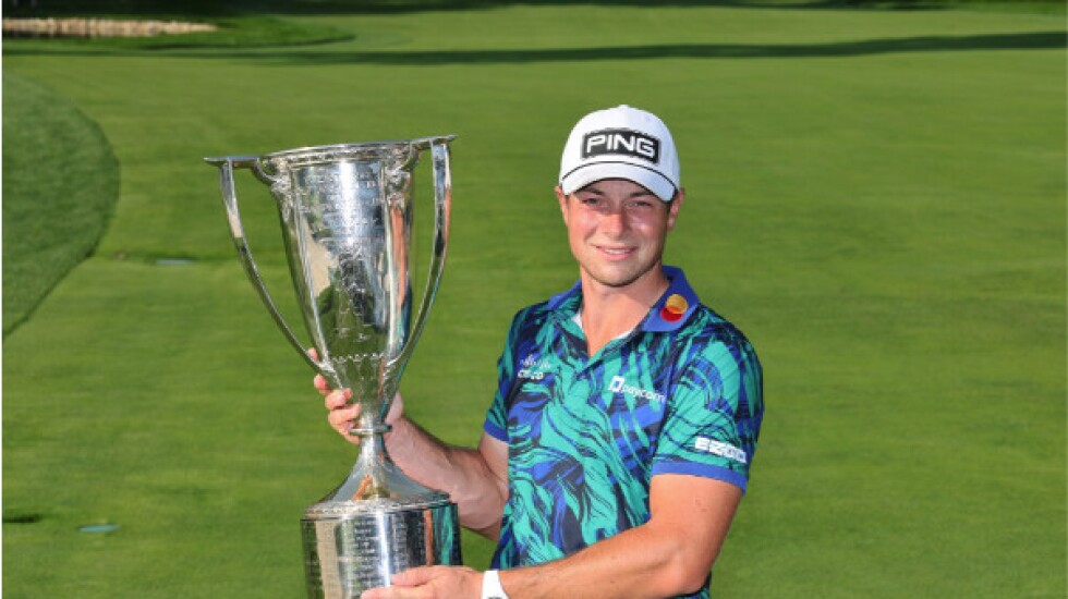 Hovland delivered the best round of his career at just the right time Sunday, turning a two-man race into a one-man show by breaking the course record with a 9-under 61 to surge past Scottie Scheffler and Matt Fitzpatrick and win the BMW Championship.