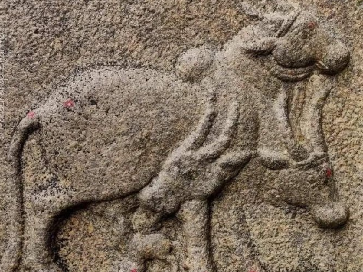 The three animals have been beautifully carved on a stone. It comprises the head of one animal looking ahead, the head of another one looking down, maybe grazing, and the head of a third one licking the calf that is feeding from the mother.