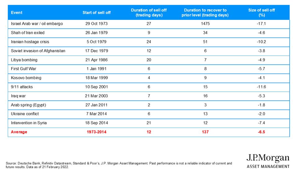 Within these observations, note the average duration of the sell-off was 12 days, with some (Egypt/Arab Spring) being as short as 2 days and the Israel/Arab war and OPEC oil embargo lasting 27 days. Note that other than one conspicuous outlier (the 1973 oil shock), the sell-offs were over rather quickly, for an average of about 16 days to recover to the prior level (excluding 1973). Thus, in most geopolitical events in recent history, we’ve seen the market undergo a quick sell-off and a quick turnaround.