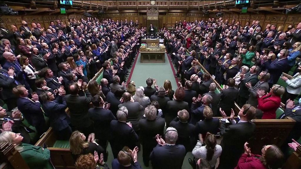 The British politicians gave the President, who has vowed to stay in Kyiv, a standing ovation at both the beginning and end of his speech.