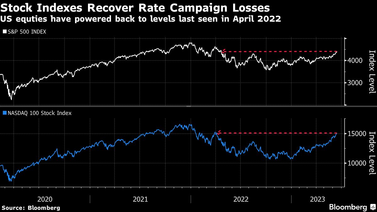 The S&P 500 index capped a fifth straight week of gains and is now higher than it was on March 16, 2022, the day the Federal Reserve embarked on the most aggressive rate hikes in four decades. US stocks are not alone — from the dollar to bond volatility to equity-market positioning, key metrics are back near levels seen before 500 basis points of rate increases.