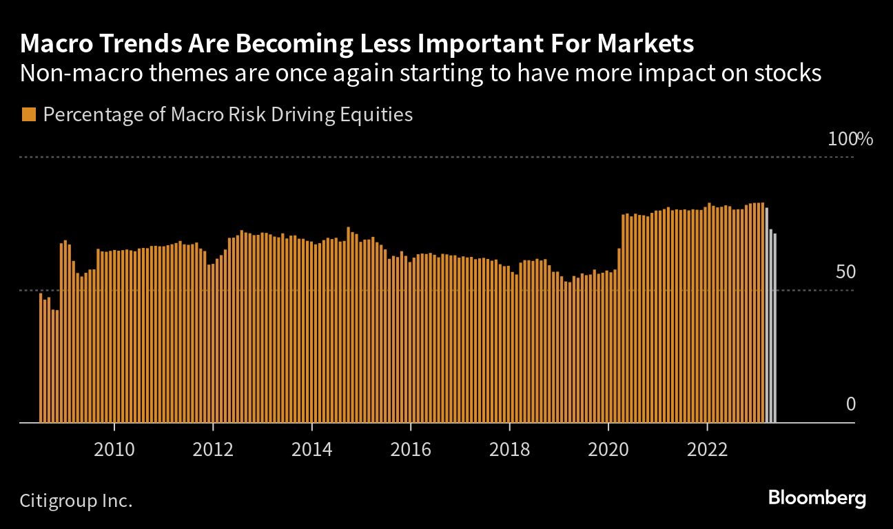 The macro contribution on equity markets has fallen to 71% from 83% since March — the biggest three-month drop since 2009, according to a Citigroup Inc. model.