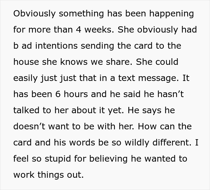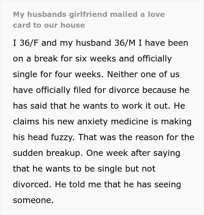 This lady opened a letter addressed to her husband and found a love letter from her husband’s girlfriend inside. When she confronted the guy, he denied everything. But, given that the couple was at the threshold of divorce, she didn’t believe him. So, she went online to ask for advice about whether she should file for divorce.