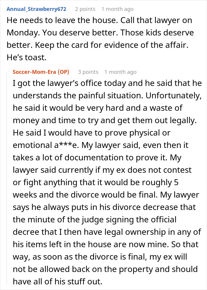 As one commenter observed, he wants to have his cake and eat it, too. “Of course he doesn’t want to officially divorce—he’s got it made! He has a wife at home taking care all of his responsibilities AND a girlfriend he barely has to hide,” u/DahliaDarling14 wrote. “All while you’re forced to watch him come & go, even if you try your best to not think about him whatsoever.”