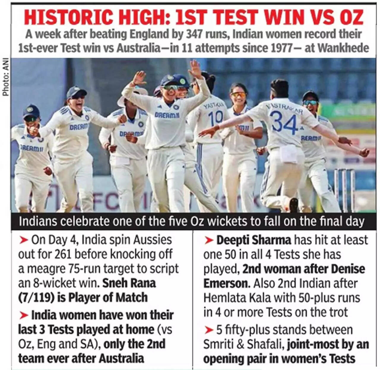 NEW DELHI: The Indian women's team's historic, maiden Test win against Australia in the one-off Test on a typical wintry Sunday morning triggered emotional scenes at the Wankhede Stadium in Mumbai.
