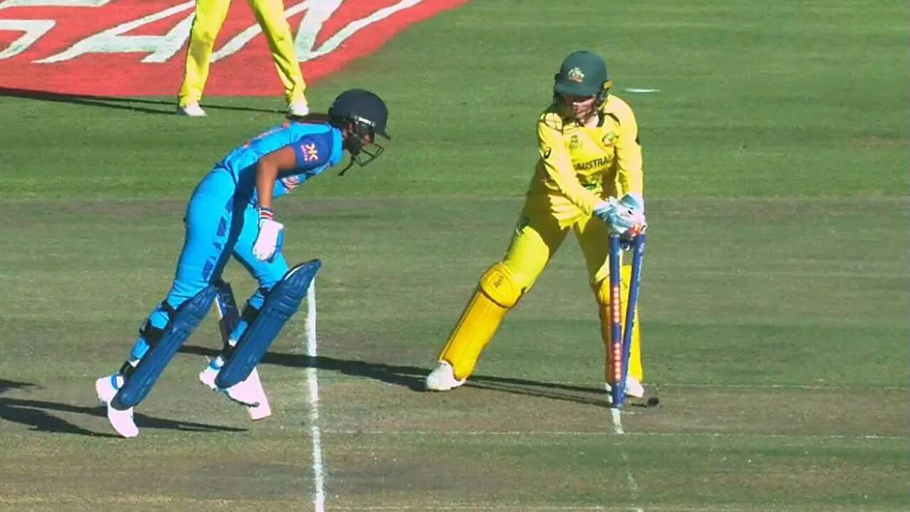 Thinking on her feet, keeper Alyssa Healy whipped the bails off in a flash and replays confirmed that it was curtains for Harmanpreet.