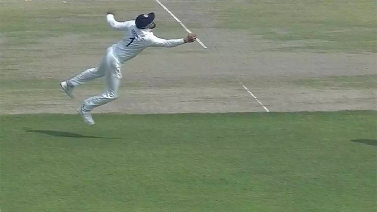 Batting on 81, Australia's top scorer of the day Khawaja went for a revere sweep against a delivery from Jadeja that was tossed up just outside the off-stump. The Australian left-hander hoped to beat the point fielder KL Rahul but he dived full length to his right to pull off a one-handed blinder.