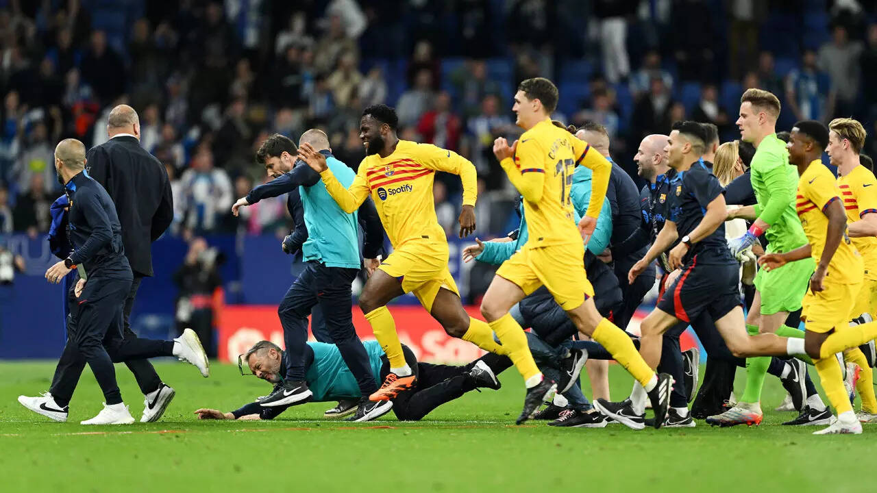 Barcelona's on-field celebrations following their 4-2 win over Espanyol, which confirmed the 27th La Liga title for Xavi Hernandez's team, were cut shot by angry Espanyol fans running onto the pitch to chase Barca players, who scampered back into the tunnel for safety.