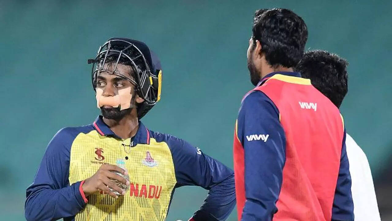 NEW DELHI: The Vijay Hazare Trophy semi-final on Wednesday witnessed something that first surprised everyone and then won hearts when it was learned that the batter, Baba Indrajith, was batting with a tape on his mouth because he cut his lip in a fall during the innings break, but still came out to do his job.