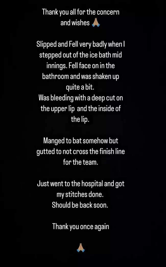 “Thank you all for your concern and wishes. Slipped and fell very badly when I stepped out of the ice bath mid-innings. Fell face-on in the bathroom and was shaken up quite a bit. Was bleeding with a deep cut on the upper lip and the inside of the lip. Managed to bat somehow but was gutted to not cross the finish line for the team. Just went to the hospital and got my stitches done. Should be back soon. Thank you once again,” Indrajith posted on Instagram.