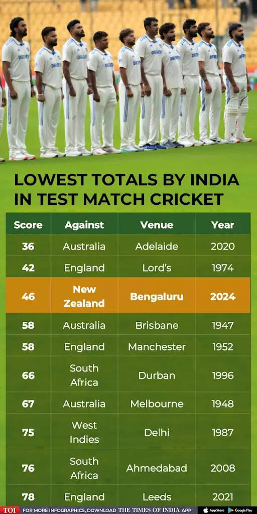 In their first innings, India were bundled out for just 46 runs - their lowest Test total at home and their third lowest Test total overall at the M Chinnaswamy Stadium in Bengaluru on Day 2 of the first Test on Thursday.