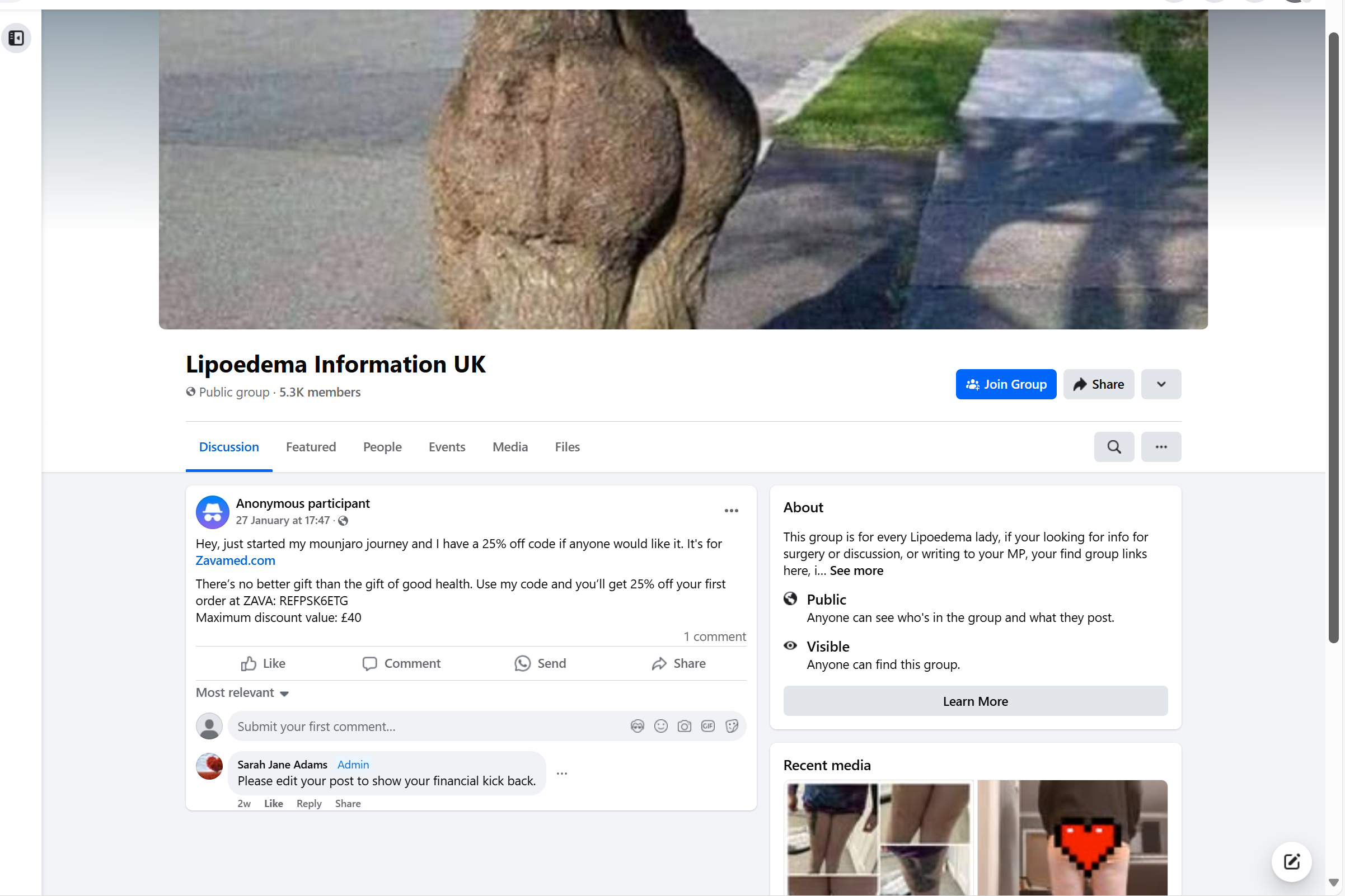 One anonymous post on the Lipoedema Information UK Public Group Facebook page stated: “Hey, just started my mounjaro journey and I have a 25% code if anyone would like it, It’s for Zavamed.com. There’s no better gift than the gift of good health. Use my code and you’ll get 25% off your first order at ZAVA: REFPSK6ETG Maximum discount value: £40.”