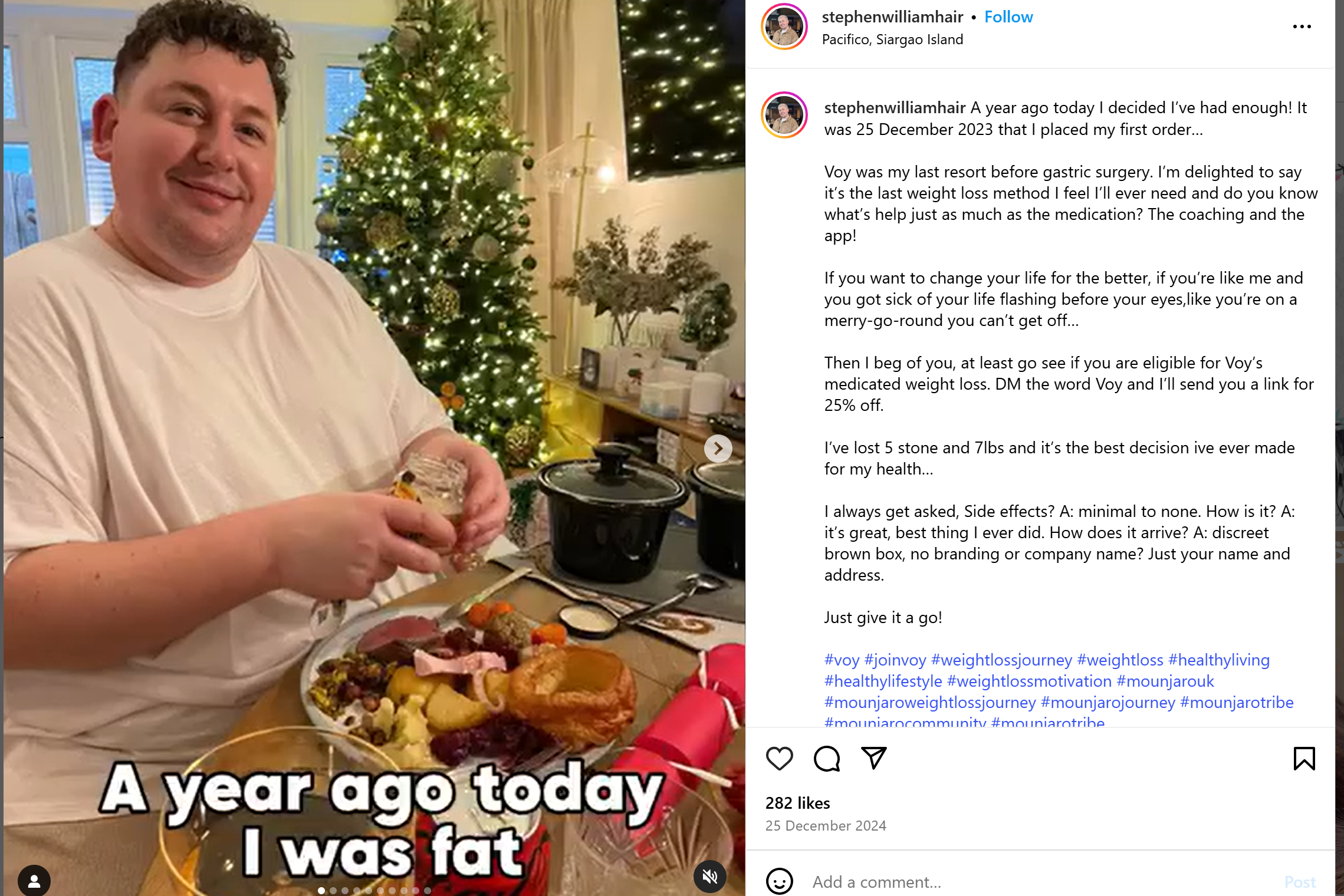 One ad, on the account stephenwilliamhair, posted on 25 December 2024, showed an image of a man with overlaid text stating, “A year ago today I was fat”. The caption encouraged people to message for a 25 per cent off voucher for Voy.
