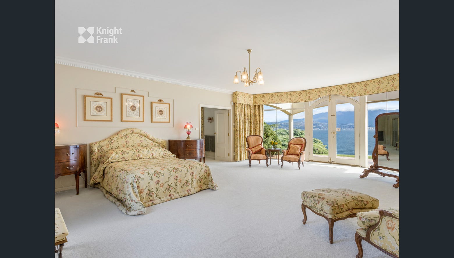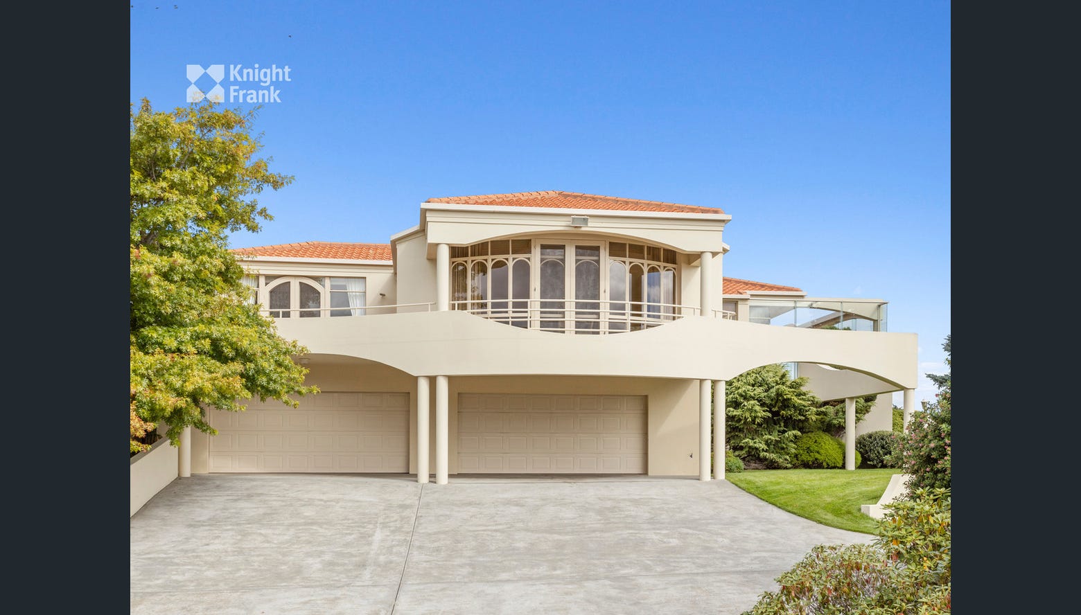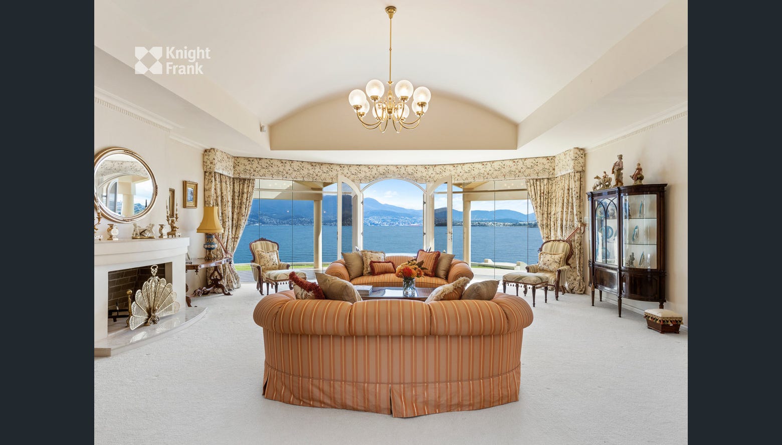 The five-bedroom, three-bathroom home is located on more than 10,000 square metres of land on Howrah Point, adjacent to Little Howrah Beach, with views of the River Derwent and kunanyi/Mount Wellington as a backdrop.