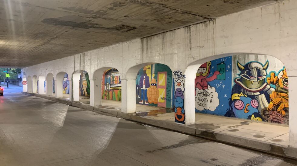 “In this piece, my character dons a whipped cream Teddy bear costume, cradling a bubble tea,” says its creator, the artist who goes by the name Luyu, who painted the piece on a viaduct on Racine Avenue near 16th Street in August as part of a larger effort to beautify the space.