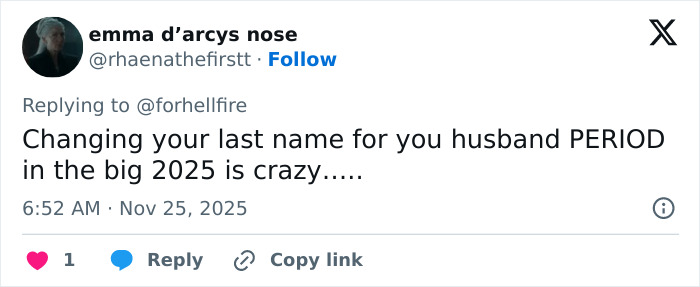 Several commenters echoed the sentiment, with one writing, “I agree that women shouldn’t change their name for their husbands who do nothing for them.”