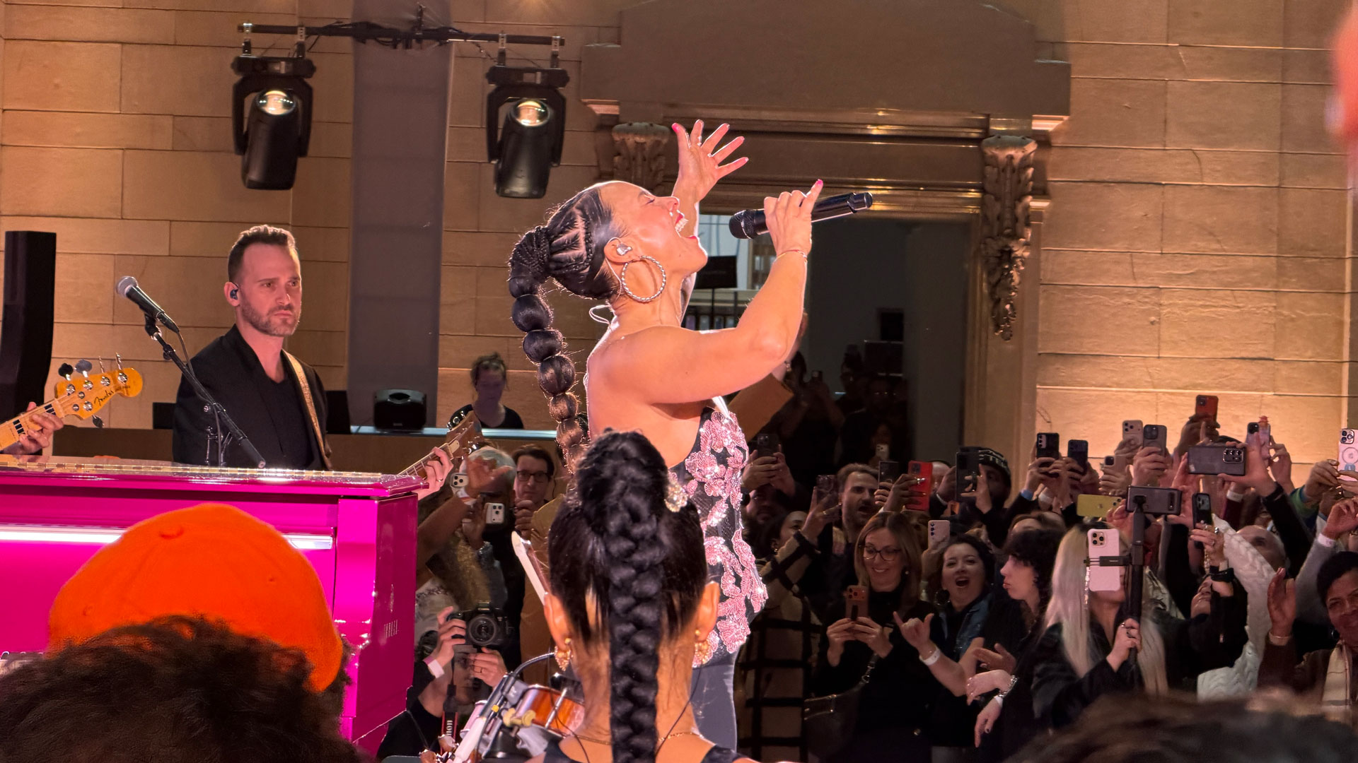 After a brief introduction by Apple Radio One’s DJ Ebro Darden, Keys sang as she played on a pink piano positioned just outside the Apple Store, right below the Apple logo and in front of hundreds crowded around her on that landing and the hundreds more in the Grand Concourse below.