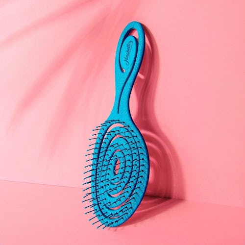 A detangling hair brush with an ergonomic shape that fits your head