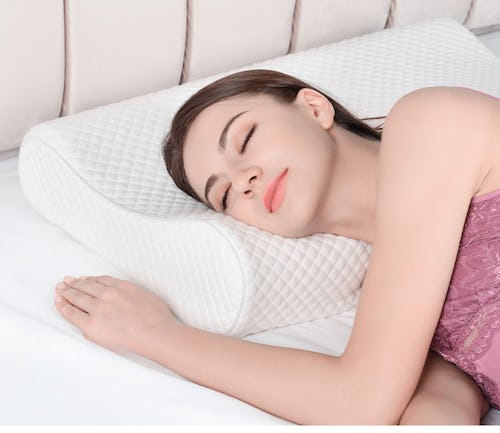 This pillow has a unique, contoured shape that offers a ton of neck and back support while you’re sleeping. The elevated sides are two different heights so you can adjust it depending on what feels most comfortable. It’s made of premium memory foam with 120 breathable honeycomb holes to maximize air circulation so you don’t overheat.
