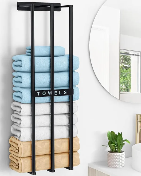 When there’s no linen closet, wall space becomes valuable real estate. This towel rack mounts directly to the wall and holds up to six extra-large bath towels (or more, if they’re smaller). The front bars keep towels in place, while the open sides let you grab what you need. You can get the rack in several finish options to best match your bathroom hardware.