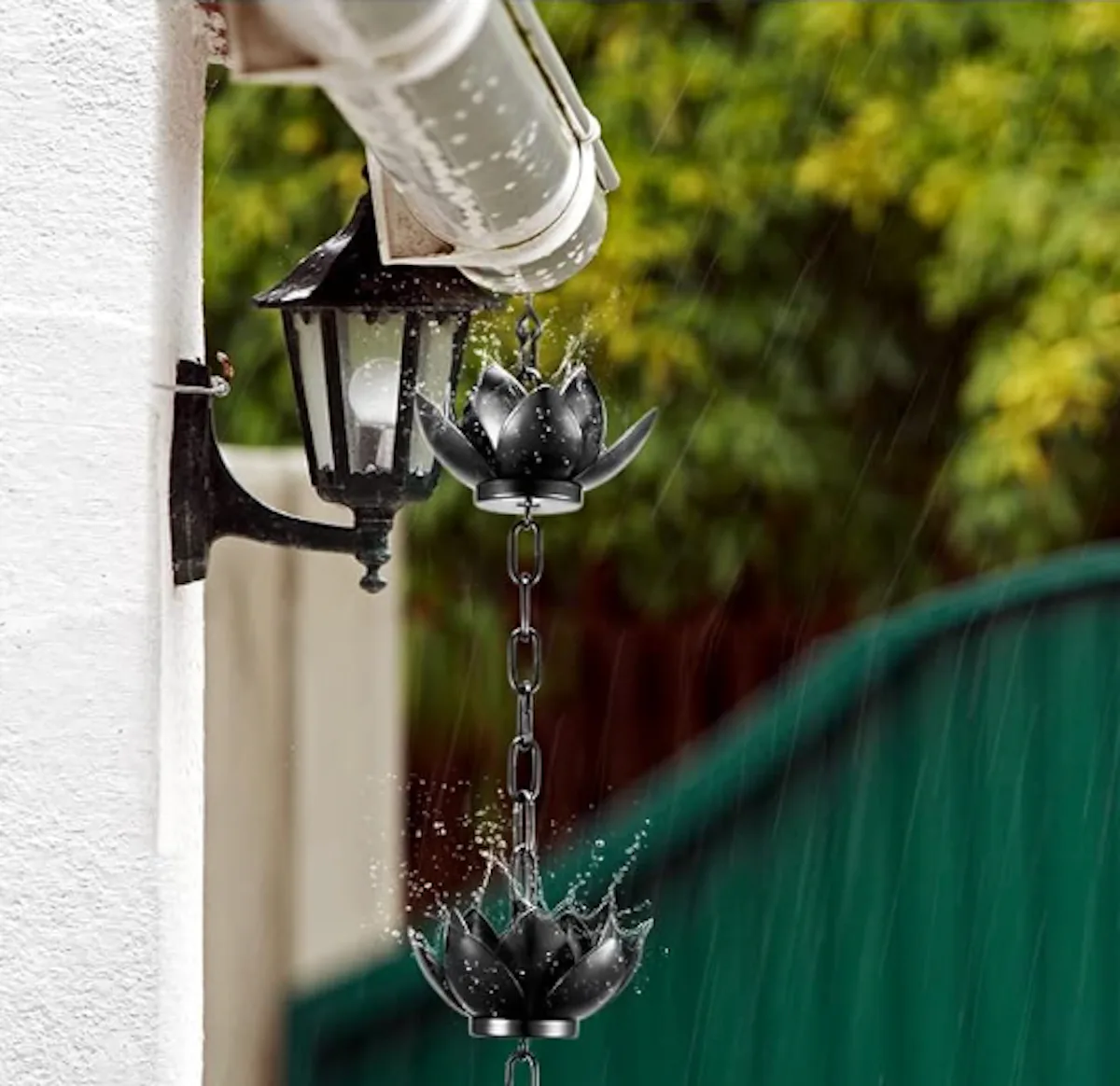 If you’re already staring at your gutter pipes during a storm, it might as well be a pretty view. This oak leaf rain chain swaps a standard downspout for a lotus-cup chain that channels water in a controlled flow with a soothing sound. The set includes an adapter for easy gutter connection, and the powder-coated iron is designed for long-term outdoor use.
