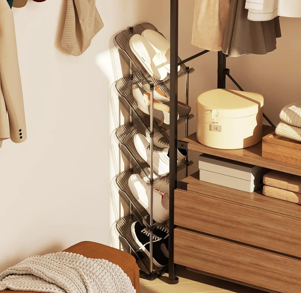 When floor space is limited, vertical storage makes all the difference. This five-tier sloping shoe rack uses a 45-degree, angled design to reduce its footprint while still accommodating boots, sneakers, heels, and high-tops. Made from sturdy plastic with stainless steel supports, the rack is washable, durable, and built to handle everyday use. The tilted shelves also make grabbing shoes easier in tight entryways or corners.
