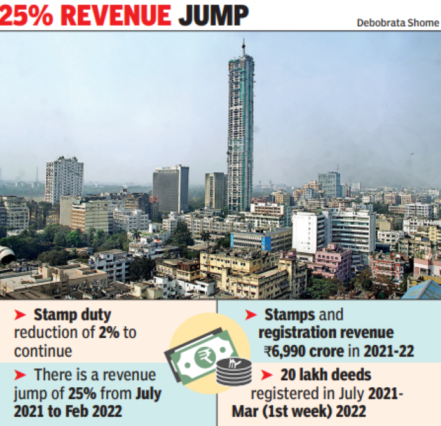 KOLKATA: The state government has again extended sops for real estate in this Budget till September 30, 2022 for six months. The state had allowed exemption of 2% rebate on stamp duty and 10% rebate on circle rate of land/property in the financial year 2021-22. The existing relief is coming to an end on March 31, 2022.