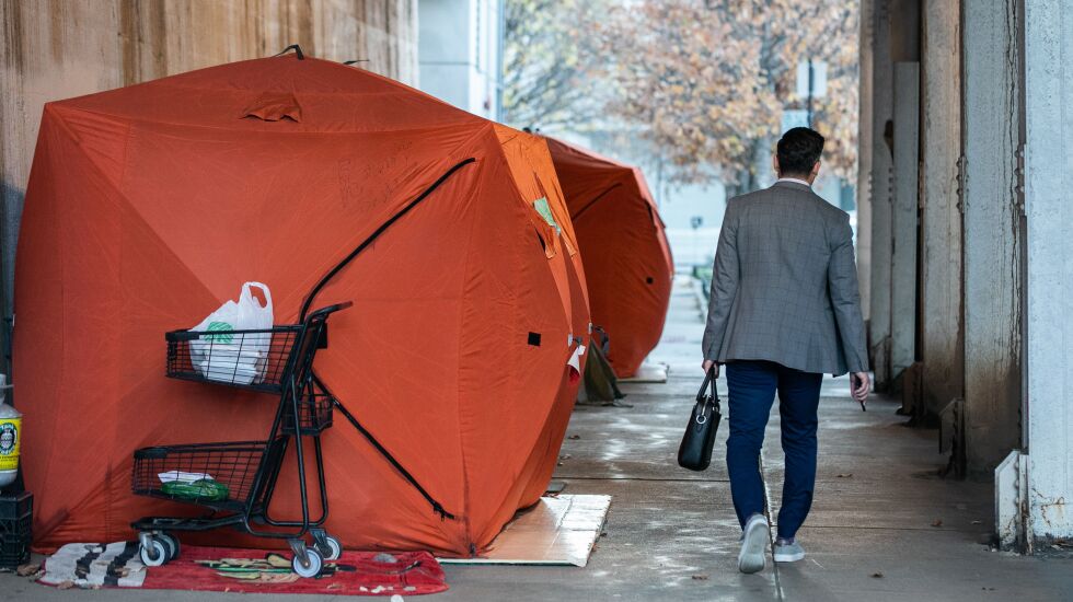 The stickers attached to the tents read that “storing personal property on the public way” was prohibited; and if the personal property was not removed, it would be “discarded by the city.” Removal would occur on Thursday at 9:30 a.m. “or any later day or time,” according to the stickers.