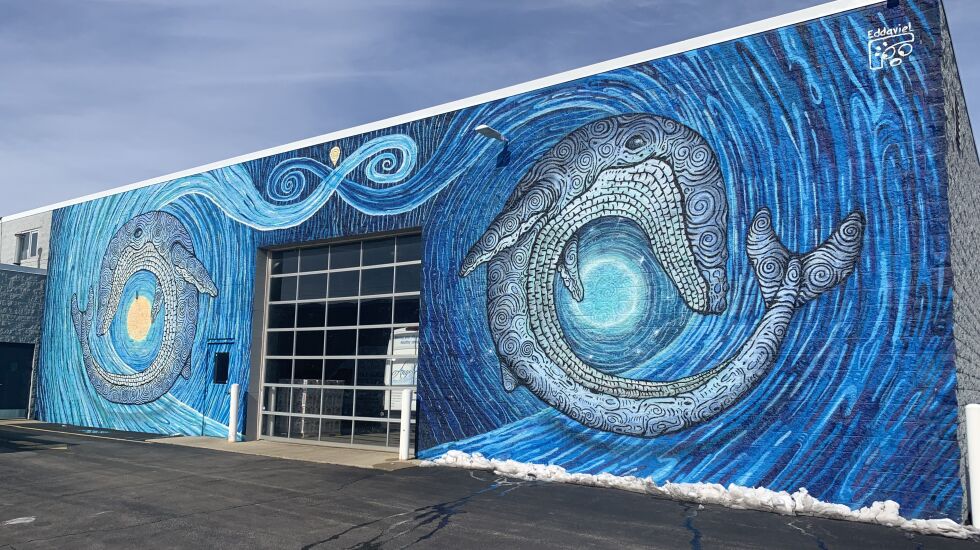 He offers his take on the huge creatures in vibrant detail in a mural showing two whales amid swirling waters that he painted at a Lake Barrington business that sells water-purification systems.