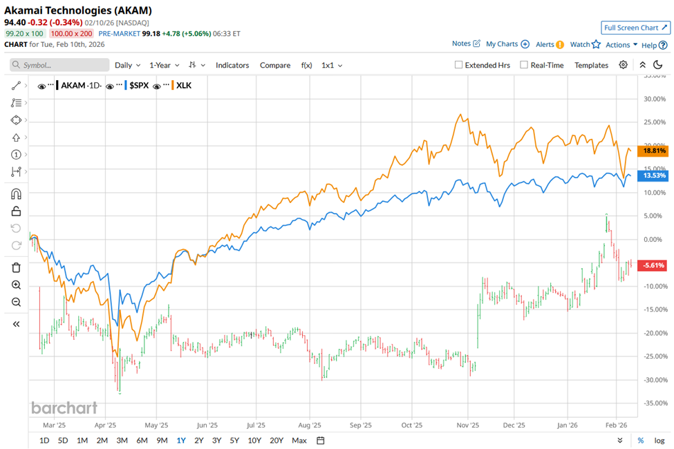 Shares of Akamai Technologies have lagged behind the broader market over the past 52 weeks. AKAM stock has declined 6% over this time frame, while the broader S&P 500 Index ($SPX) has rallied 14.3%. However, shares of the company are up 9.2% on a YTD basis, compared to SPX's 1.3% gain.