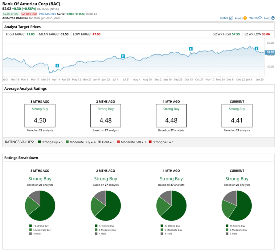 On Jan. 15, Morgan Stanley (MS) kept an “Overweight” rating on BAC and lowered the price target to $64, implying a potential upside of 23% from current levels.
