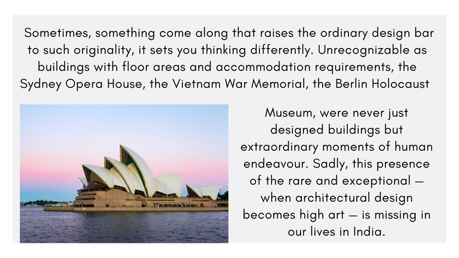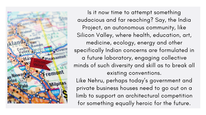More and more, the radical view must ask awkward and impossible questions. Could the abandoned nuclear power plant at Dadri, outside Delhi, be converted into a museum like the Tate Modern, or an unusual theatre complex? Would the government consider using the entire stretch of the Central Vista to recreate underground galleries and museums? In fact, could the new Parliament and other buildings appear out of a 3D printer, without years of construction dust and air pollution?