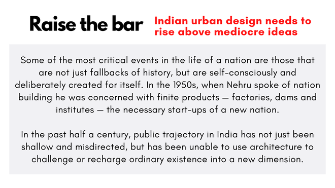 A couple of years ago, Rajesh Advani, a young architect, reacting precisely to such a call, advanced an elaborate initiative called Unbuilt India — an active search for a collective of architectural ideas that could change the country. An overwhelming response from students and professionals gathered a vast array of designs: from constructing high-rise parks in dense neighbourhoods, covering roads with vegetable gardens, reviving water sources in drought-hit areas, inserting housing for the homeless under flyovers, pedestrianising polluted urban centres, designs for tree houses, and stacked tunnel houses saving city land, among others. Drawings came off architectural shelves and out of office computers in so varied a range, it was enough to give a complete makeover to India’s thoughtless and desperate cities. The initiative was so heroic in scope and rife with such possibility, it was only natural for it to be rejected in a country consumed by self-doubt and lacking public confidence.