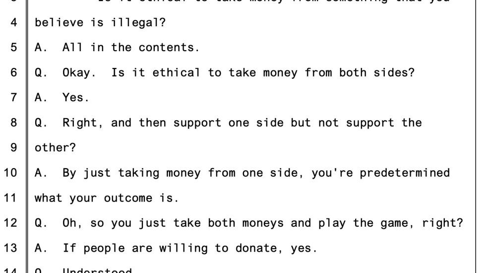 “Oh, so you just take both moneys and play the game, right?” the lawyer asked.