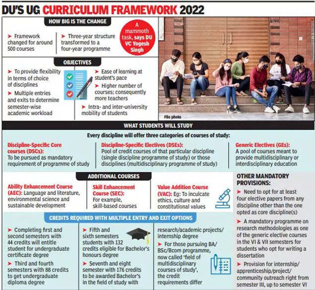 NEW DELHI: A draft framework for the undergraduate curriculum framework based on the National Education Policy 2020 released by Delhi University on Friday states that a student will require 176 credits for the four-year undergraduate programme.