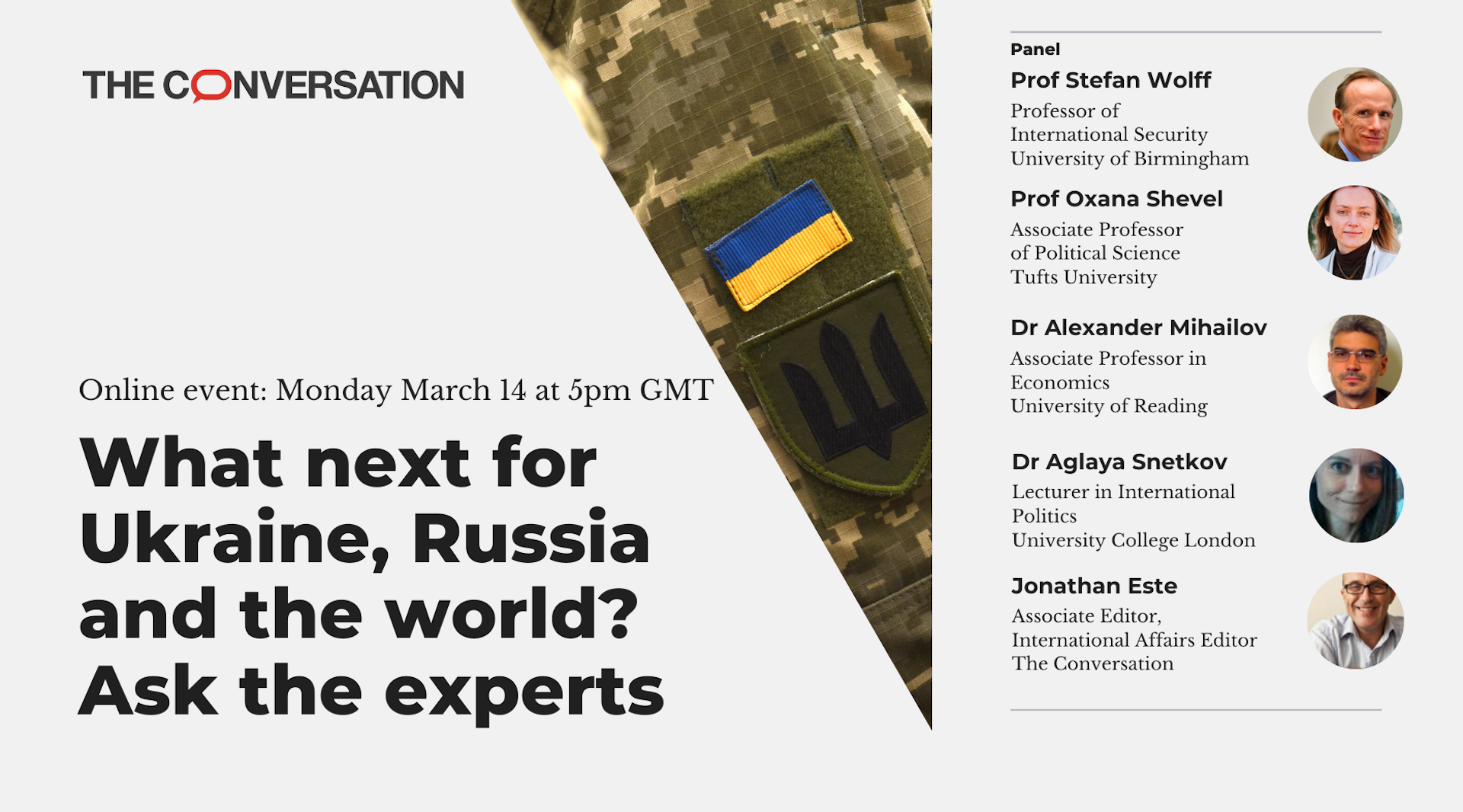 I will be chairing this event. Please feel free to send me your questions in advance, on any aspect of the crisis, to this email address: uk-webinars@theconversation.com, marked “Ukraine event”.