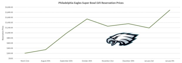 Throughout that 8–0 start, the Eagles’ Super Bowl ticket reservation price climbed from $344 all the way to more than $1,500, as Philadelphia asserted itself as a clear favorite in the NFC. The second half of the season was slightly bumpier: Hurts missed two games with a shoulder injury, and the Eagles lost both games, but his return in Week 18 in a win over the Giants led to one last surge in the team’s reservation price to nearly $1,900 heading into the playoffs. The Eagles’ performance Saturday in a 38–7 win over the Giants to advance to the NFC championship game left little doubt about this team’s Super Bowl mettle, but getting through the Niners on Sunday won’t be easy.