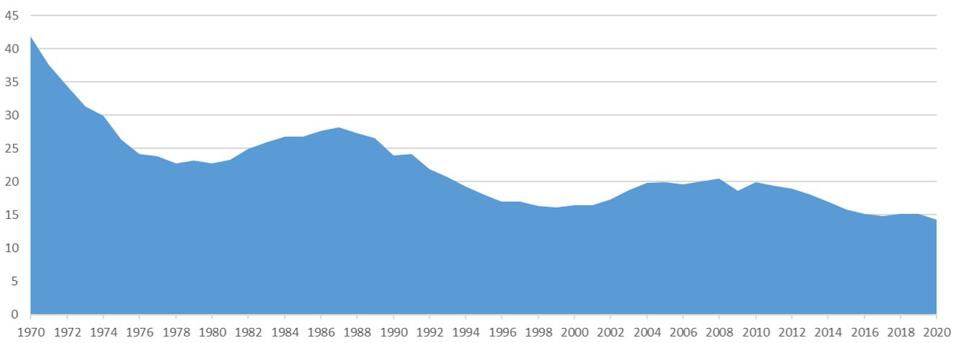 During the 1980s, President Reagan built up America’s defense capabilities to deter the threat of Soviet expansion. His goal was to outspend the USSR militarily knowing that its economy could not match the prowess of the United States. The result was a steady expansion in US military spending relative to total federal outlays throughout the decade. Reagan was able to so, because the Federal Reserve under Paul Volcker succeeded in bringing inflation under control.