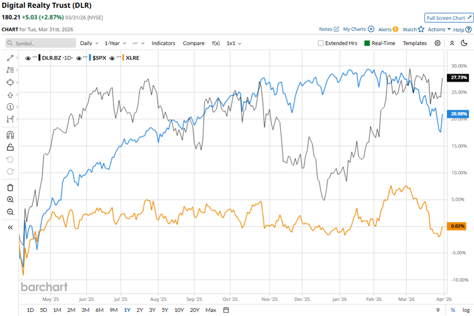 DLR stock has increased 26.8% over the past 52 weeks, outpacing the broader S&P 500 Index's ($SPX) nearly 17% gain and the State Street Real Estate Select Sector SPDR ETF's (XLRE) 1.4% decline over the same time frame.