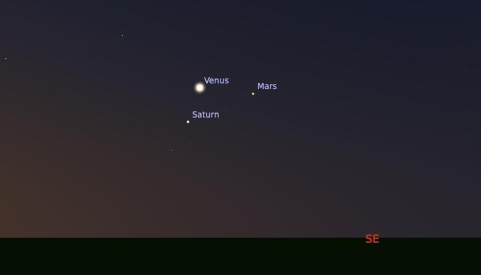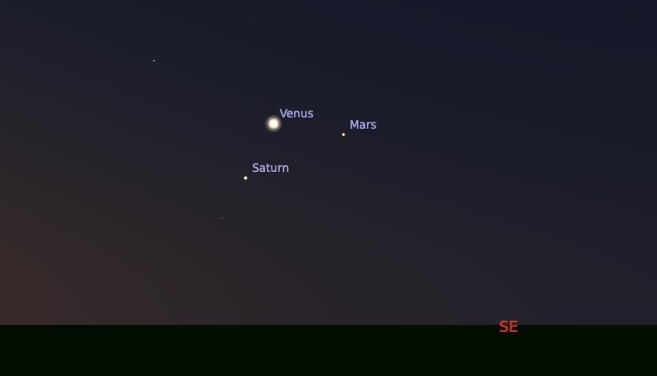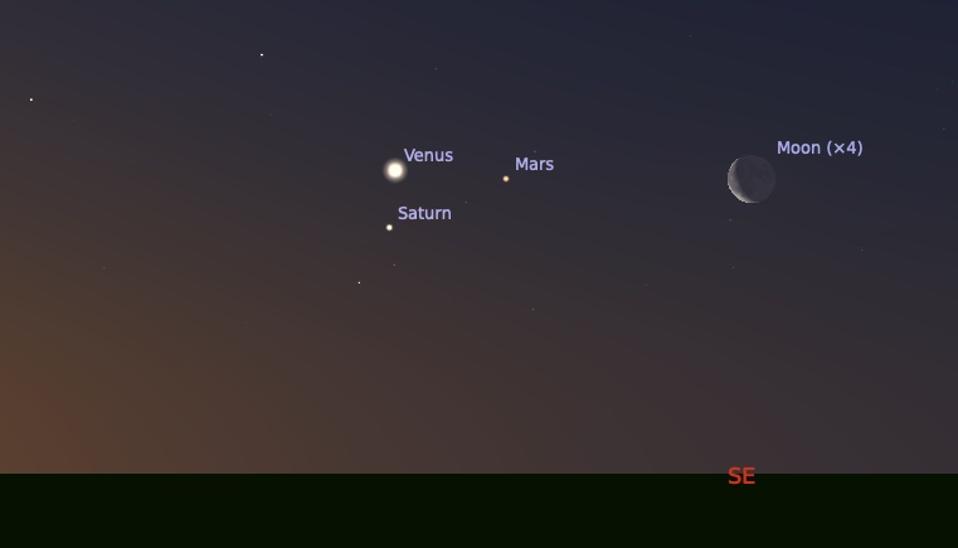 Although the crescent Moon will be someway to the south—to the right-hand side, as you look east—the sight of it close to a tightening triangle of planets will be worth seeing.