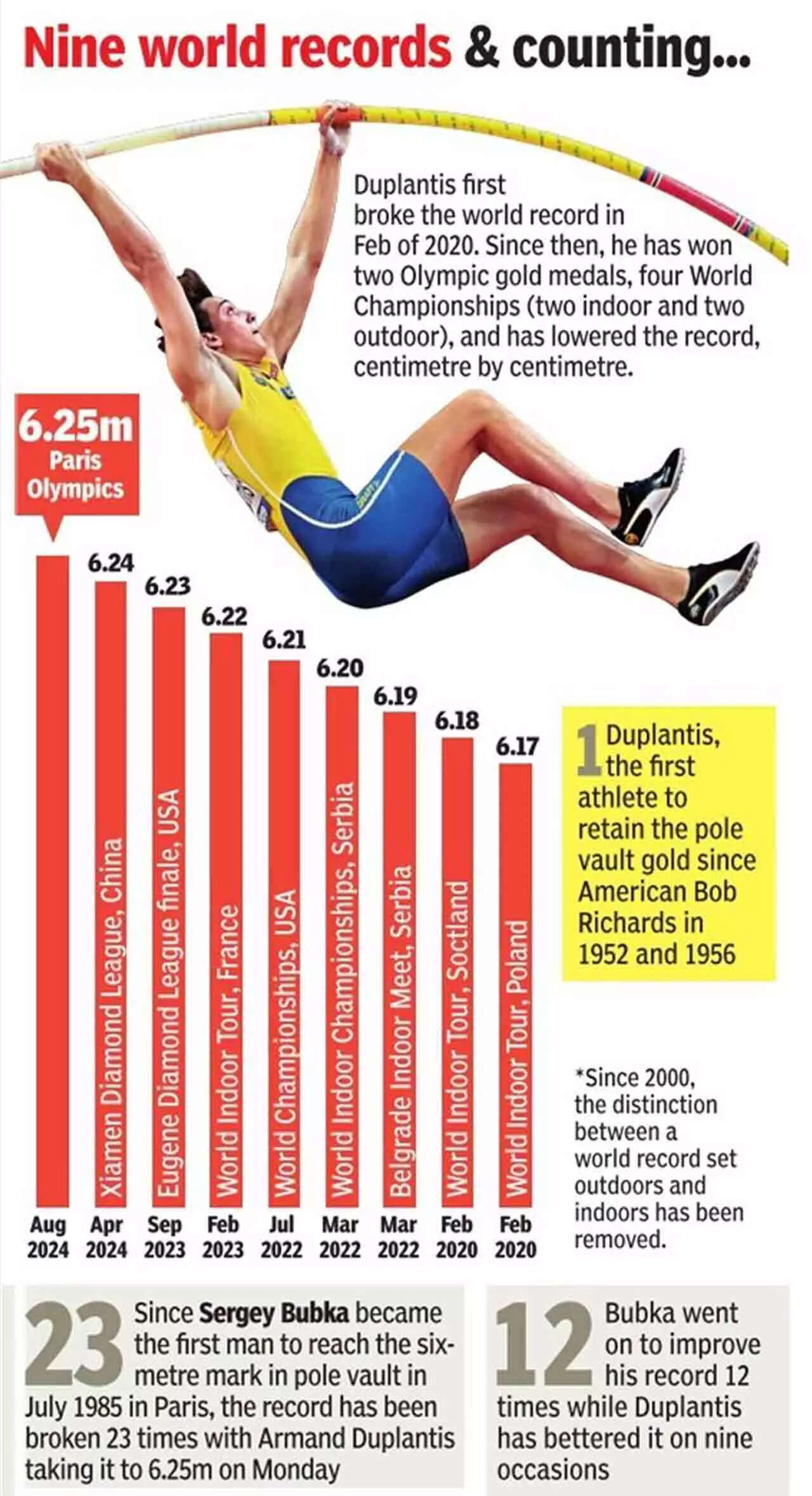 The colourful Swede had the whole world as his stage as he wowed the fans with the viral pose of Turkiye shooter Yusuf Dikec after pocketing the Olympic record when the bar was raised to 6.10m. Duplantis then went after his own heights after his rivals failed to go above 5.95m. The world record holder at 6.24m asked it to be raised by another centimetre and began his quest to clear 6.25m or 20.5 feet.