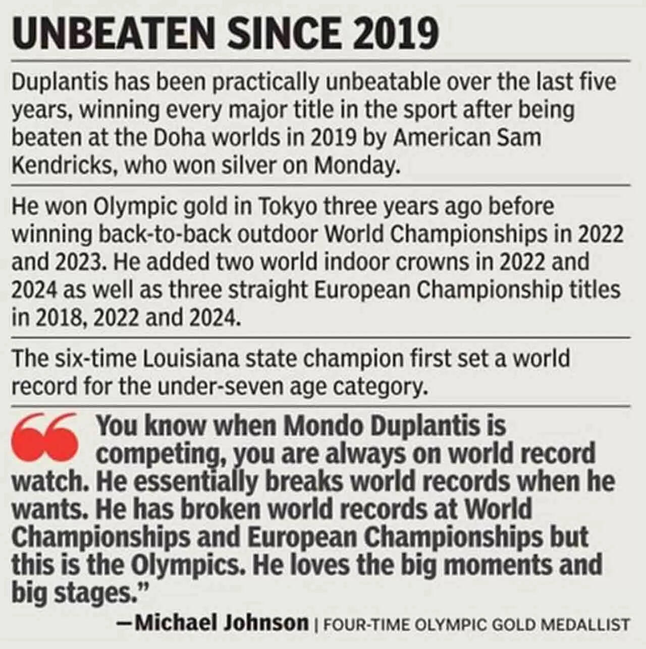 Kendricks, one of Duplantis' big fans, was elated with his show. "I was jumping well with good friends, in front of my family, my baby boy was out in the crowd. Gave him a kiss after every jump, gave my wife a kiss after every jump, that's just so special. Make or miss, medal or no medal, I was going to make it fun. I was going to put the pressure on everyone to look at us, look at us in the wide open space, under the bright lights together, that's what sport is about."