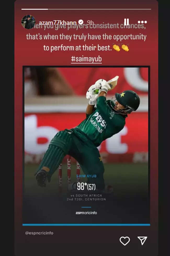 NEW DELHI: Pakistan wicketkeeper-batsman Azam Khan shared an Instagram story praising his teammate Saim Ayub. Despite Pakistan's seven-wicket defeat in the second T20I against South Africa at SuperSport Park in Centurion, Ayub impressed with an unbeaten 98-run innings.