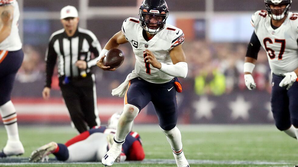 If the Patriots game is any indication, there’s a hole in my theory that teams eventually will figure out how to contain Fields as a ball carrier. Let’s not minimize the opponent. Some of us in the media had framed the game as Fields and coach Matt Eberflus versus Patriots coach Bill Belichick, who is known for identifying what an offense and a player does best, fracking it and daring the other team to beat New England another way. The assumption was that Belichick would figure out how to stop Fields from running the ball – his clear strength – and force him to prove he could make the throws that good quarterbacks make.