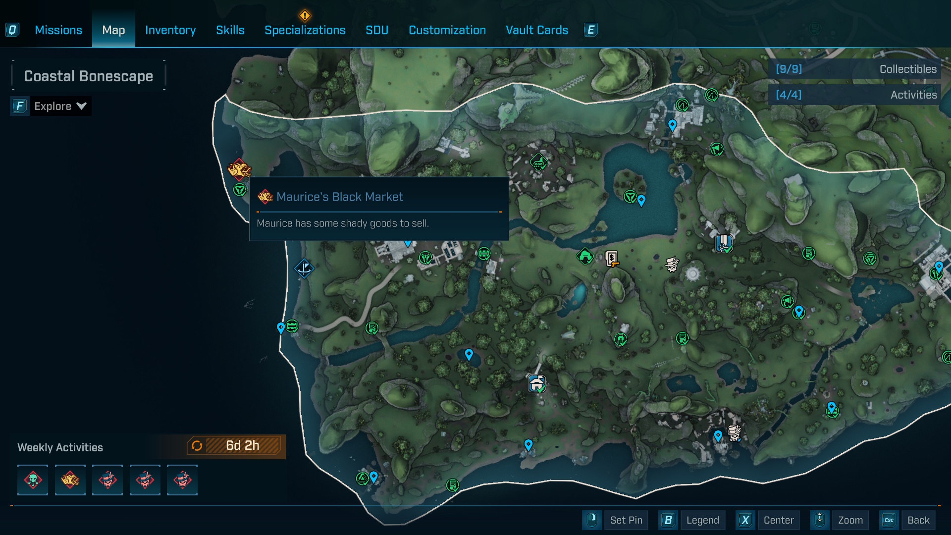 Thankfully, it's pretty easy to find the vending machine this week. All you have to do is fast travel to the Abandoned Post safehouse and then either walk or drive your way to Sandytoes Villa on the western edge of Coastal Bonescape. Here, you'll find Maurice's Black Market vending machine by the pier under the house.