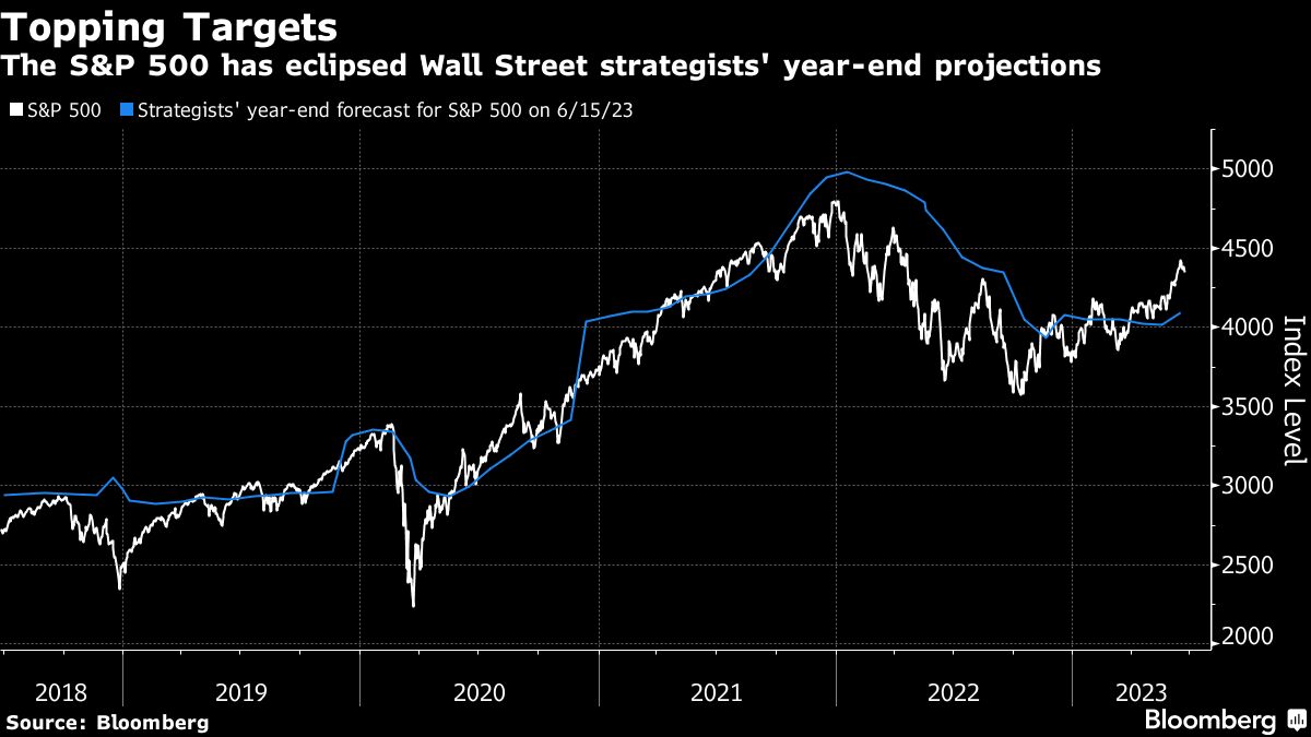 Of course, stocks have far surpassed Wall Street’s expectations for 2023. At the start of the year, strategists forecast that the S&P 500 would be flat this year, and they enter the second half anticipating that it will finish the year about 6% below its Friday close.