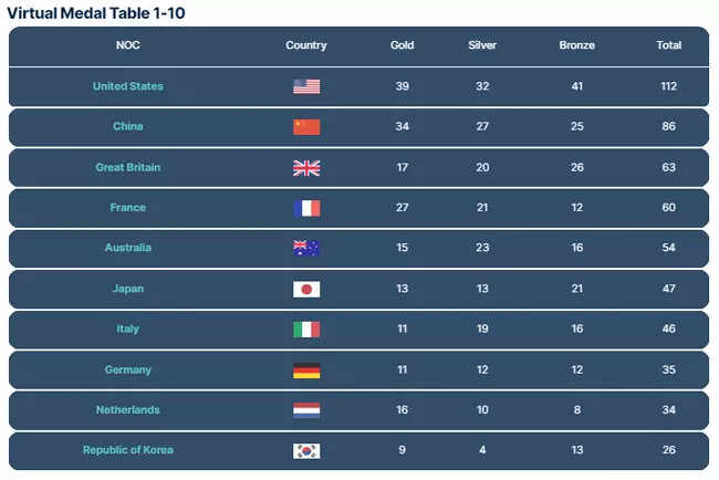 The United States is expected to win a total of 112 medals, comprising 39 gold, 32 silver, and 41 bronze. China, on the other hand, is predicted to secure 86 medals in total, with 34 gold, 27 silver, and 25 bronze.