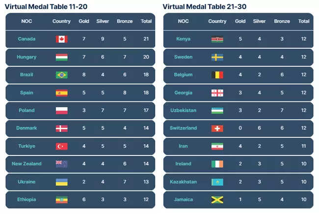 Rounding out the top 20 are: Canada (21 total - 7 gold), Hungary (20-7), Brazil (18-8), Spain (18-5), Poland (17-3), Denmark (14-5), Turkey (14-4), New Zealand (14-4), Ukraine (13-2), Ethiopia (12-6).
